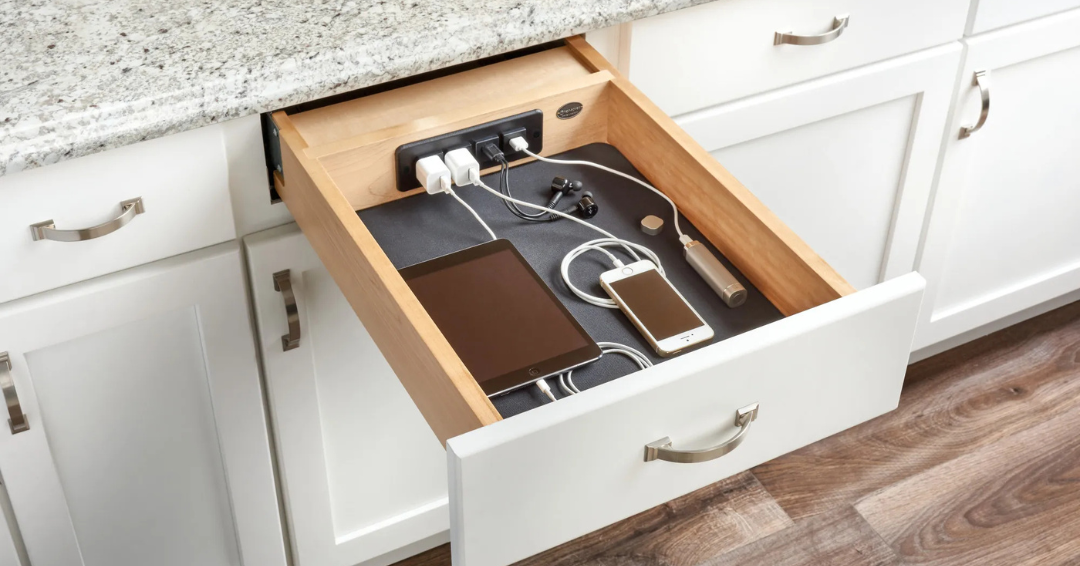 Clutter from charging cords and devices is unsightly. Hide them in a drawer or cabinet using USB-type outlets built into the cabinetry for a cleaner look.